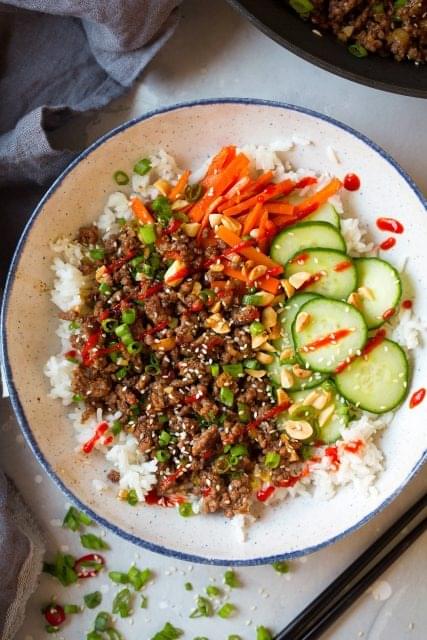 3. Serve the beef hot, over rice (quinoa or cauliflower rice), topped generously with the pickle carrots, cucumber, scallions and sesame seeds. You can also use other vegetables such as pickle radish or broccoli.